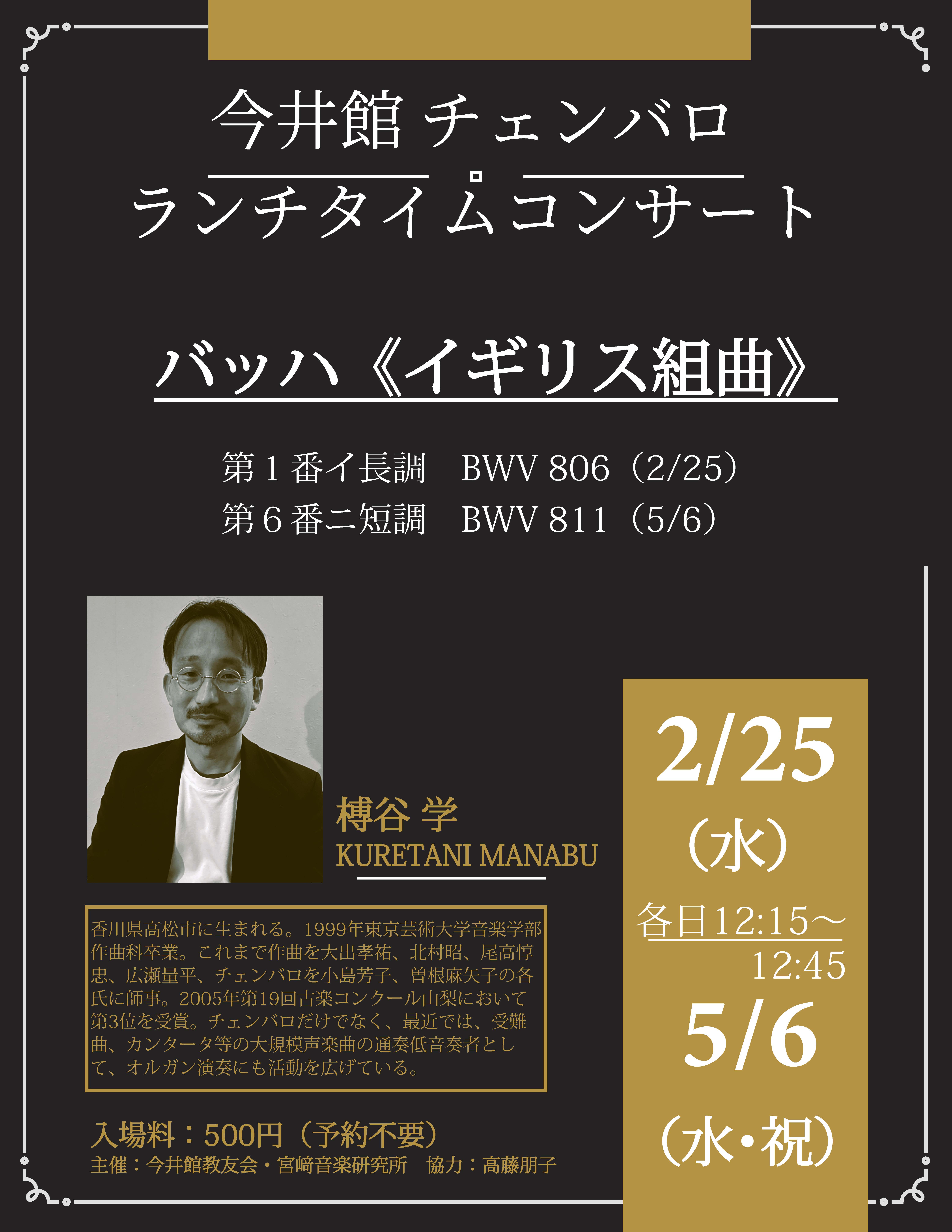 チェンバロランチタイムコンサート バッハ《イギリス組曲》2026年2/25(水)5/6(水・祝)12:15(開演)