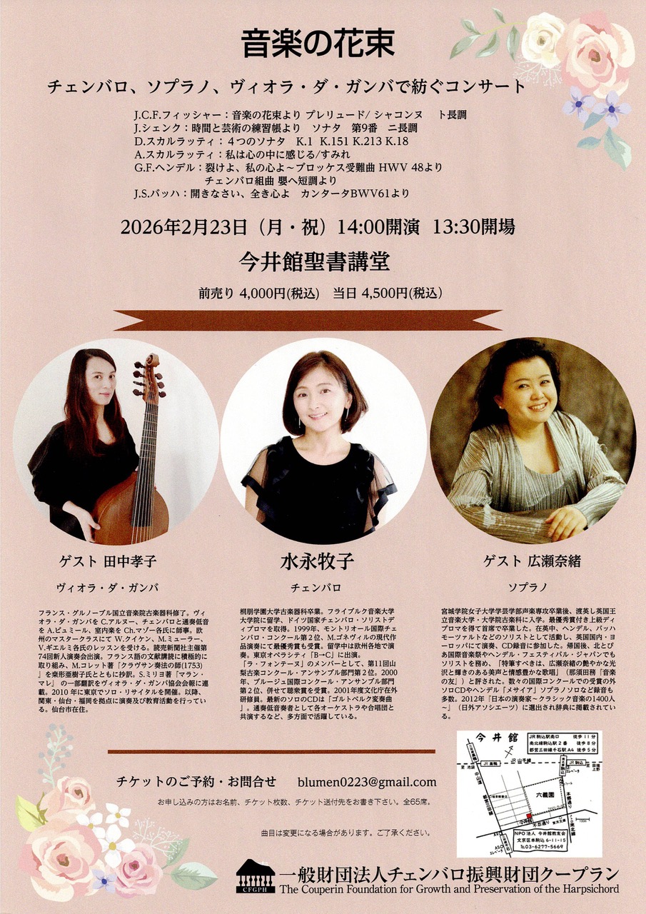 2026年2月23日(日)14:00(開演)音楽の花束 チェンバロ、ソプラノ、ヴィオラ・ダ・ガンバで紡ぐコンサート
