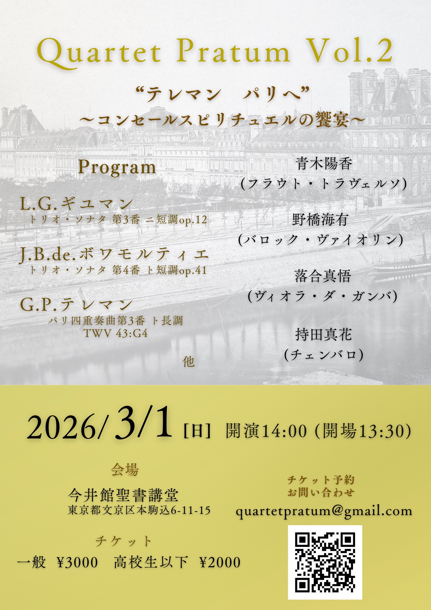 2026年3月1日(土)14:00(開演)Quartet Pratum Vol.2 テレマン 巴里へ~コンセールスピリチュエルの共演